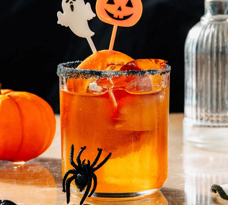 Apple Cider Margarita:Tequila, Apple Cider Syrup, Lime Juice, poured over clear ice. Served in a rocks glass rimmed with black sugar, garnished with a blood orange slice and a few spooky drink picks.